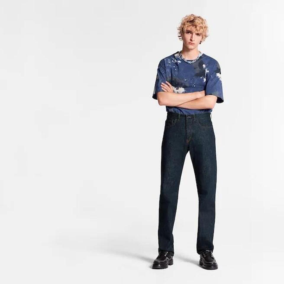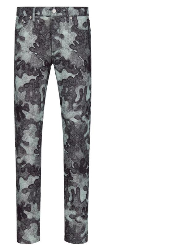 Dior - The slim-fit jeans are part of the collaboration with the artist Peter Doig. Crafted in deep blue cotton denim, they are adorned with an all-over DIOR AND PETER DOIG Camouflage jacquard, while hallmark DIOR topstitching is featured on the rear pockets. The jeans can be paired with the matching denim overshirt to complete the look.$1,200