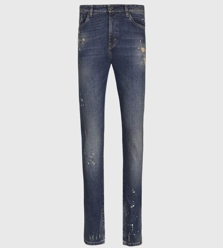 Paul Stuart Cut from distressed and washed denim with paint splatter detail, this vintage inspired, 5 pocket jean has a worn-in flattering fit that looks great with a simple cashmere sweater and biker jacket. $565