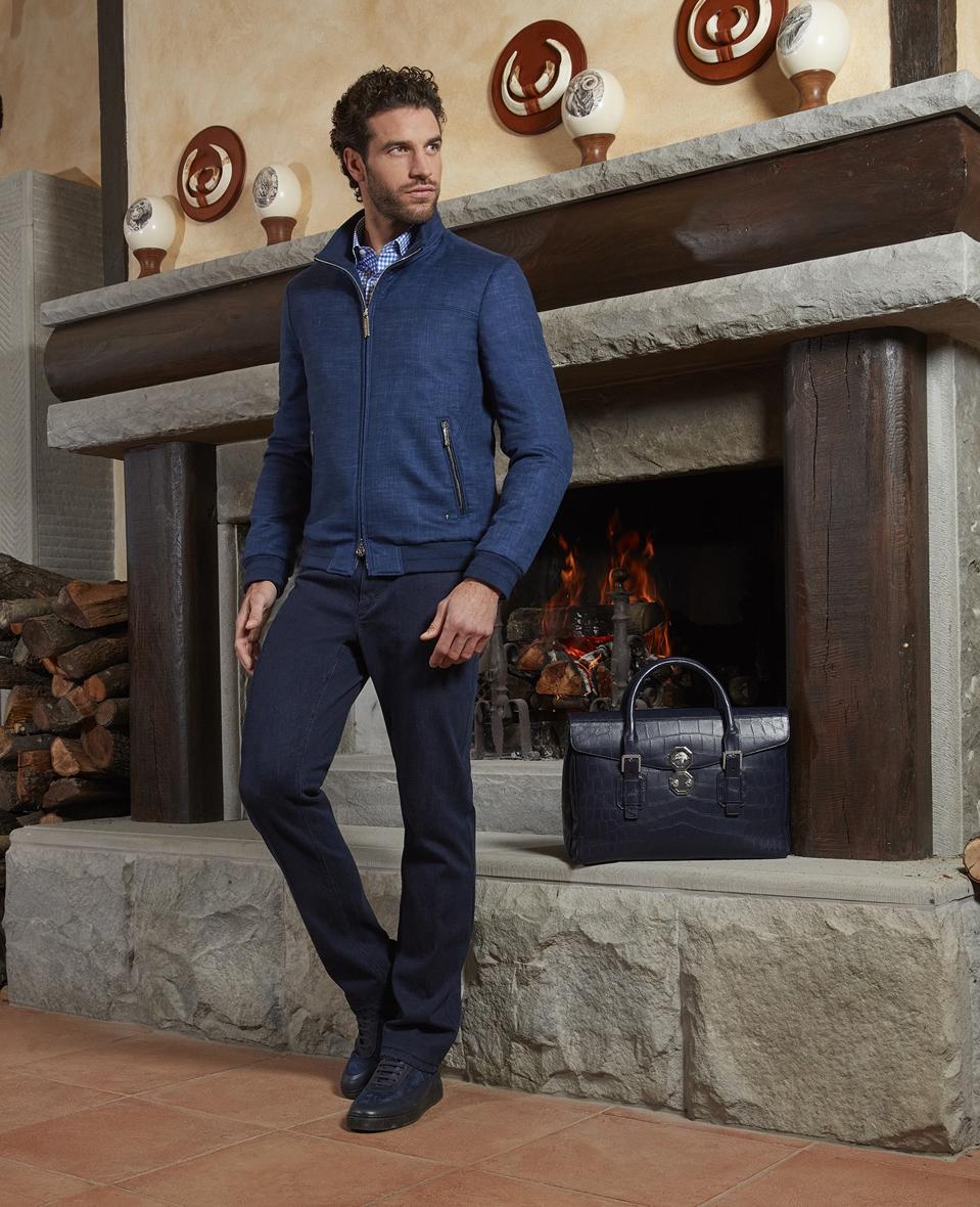 Canali—Five-pocket cotton jeans from the Black Edition line; features clean lines and an ergonomic fit that offers total comfort. Ideal for urban travellers who look for functional pieces in their metropolitan adventures. $425