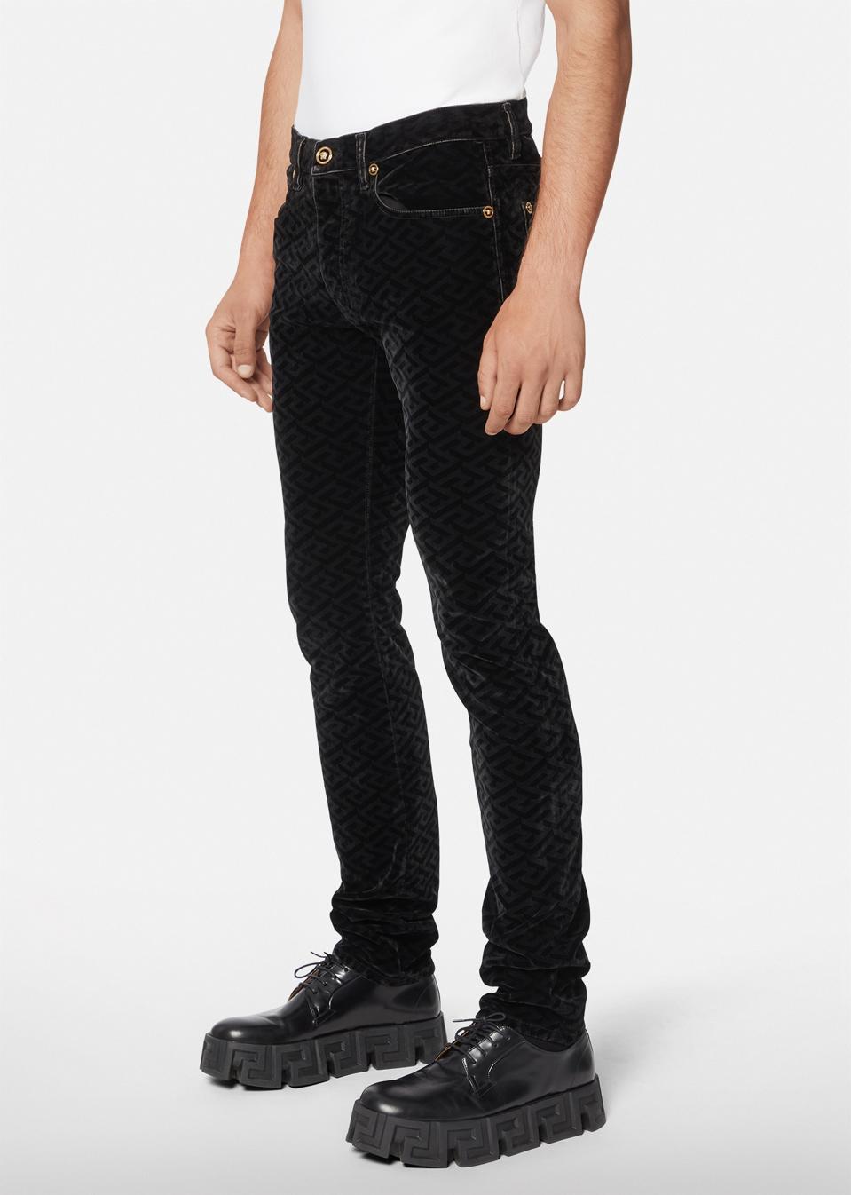 Versace-A wardrobe staple, these jeans feature a slim silhouette and golden Medusa buttons and rivets that enliven the style. The design features a flocked La Greca print - a geometric pattern with sharp angles, clean lines and a strong palette that represent power and self-confidence. $1,295