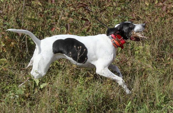 Jordy, a 2-year-old English pointer owned by Superior's Mark Fouts, was holding a solid point nearby, indicating the imminent presence of a grouse or woodcock.