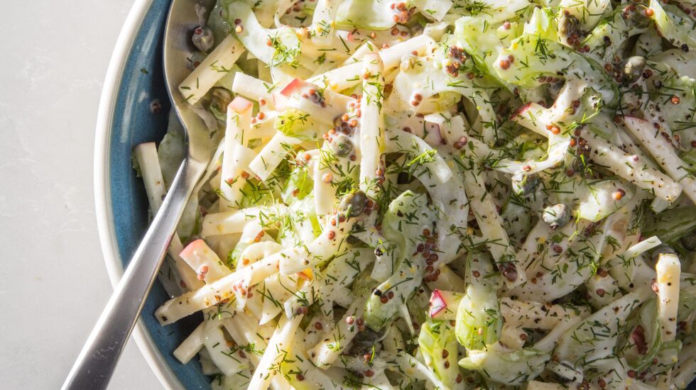 Whisk mayonnaise, mustard, lemon juice and brine together in a large bowl. Halve fennel bulb; core and slice thinly crosswise. Add fennel bulb, celery, apple and capers to bowl; toss to combine. Season with salt and pepper to taste. Top with fronds and serve. (Adapted from “Modern Bistro,” America’s Test Kitchen.)