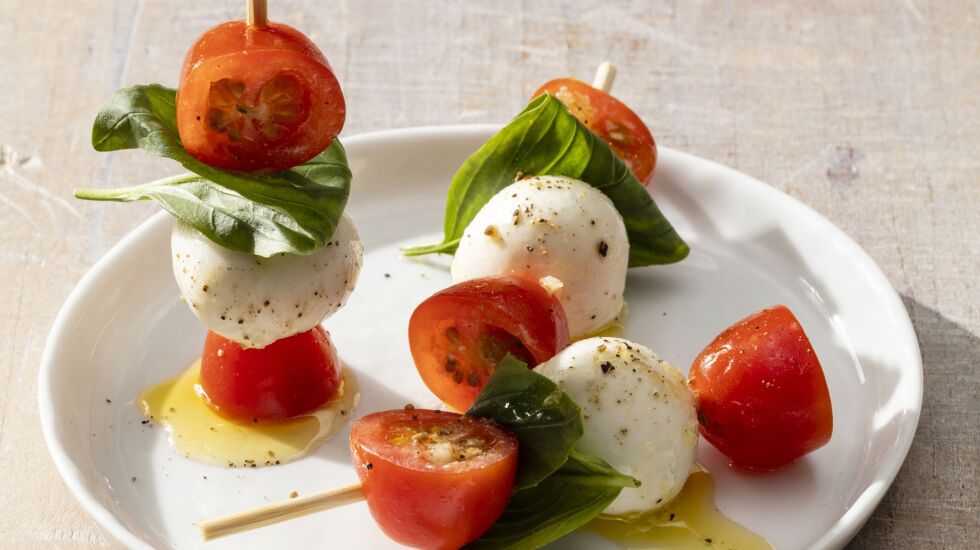 Whisk oil and garlic together in small bowl. In separate bowl, toss tomatoes and season with salt and pepper. On short wooden skewers, lace tomatoes, basil leaves and mozzarella balls in this order from top to bottom: tomato half, basil leaf (folded if large), mozzarella ball, tomato half with flat side facing down. Use flat side of bottom tomato to stand each skewer upright on serving platter. Drizzle with remaining garlic oil and season with salt and pepper. Serve. (Adapted from “The Complete Small Plates Cookbook,” American’s Test Kitchen.)