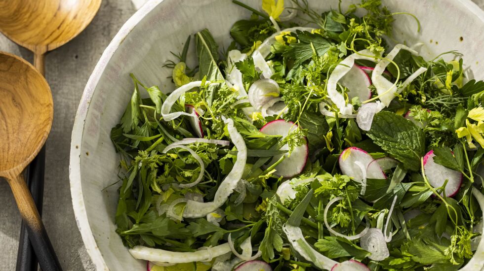 In a large bowl, use a whisk to combine 3 tablespoons extra-virgin olive oil, 1/4 teaspoon grated lemon zest, 1 tablespoon lemon juice, 1/4 teaspoon coarse salt and pepper to taste. Add 2 cups Italian parsley leaves and 2 cups mixed tender herb leaves; toss until evenly coated with dressing. Season to taste with additional coarse salt. Serve immediately. (Adapted from “Modern Bistro,” America’s Test Kitchen.)