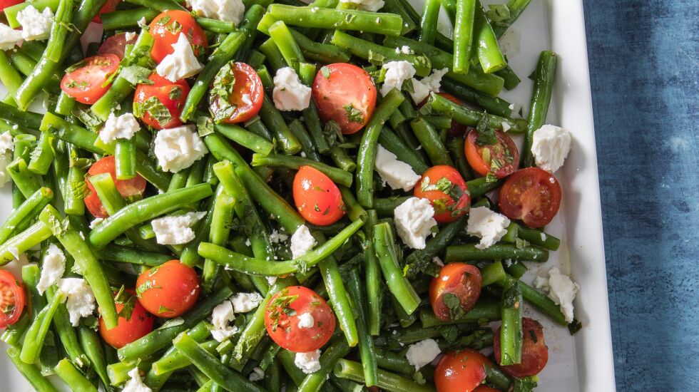 In a large saucepan over high heat, bring 2 quarts water to a boil. Add green beans and 1 tablespoon salt; return to boil and cook 5 to 8 minutes or until beans are bright green. Meanwhile, fill a large bowl halfway with ice and water. Drain beans in colander and immediately transfer to ice bath. Drain when beans are no longer warm to touch. Dry thoroughly. Place beans, tomatoes, oil, mint, parsley, juice, pepper and 1/4 teaspoon salt in bowl and toss to combine. Transfer to serving platter; sprinkle with feta and serve.