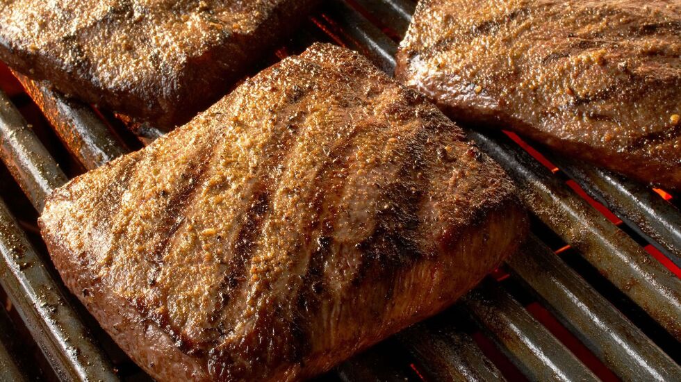 Combine 2 teaspoons fresh thyme, 2 teaspoons minced garlic and 1/2 teaspoon pepper; press evenly onto 1 beef flat iron steak (about 1 pound). Place steak on grill over medium, ash-covered coals.