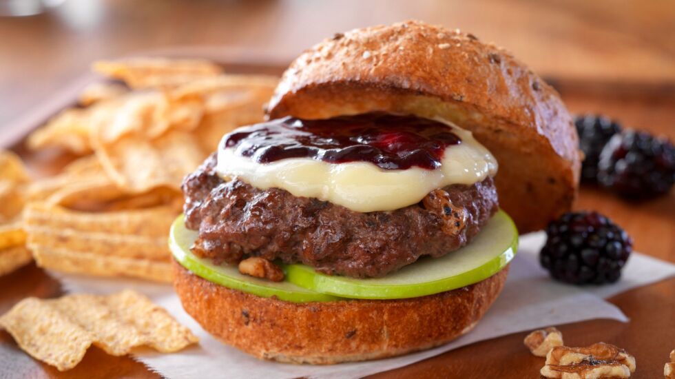 Combine ground beef, walnuts, salt and pepper in a medium bowl; mix lightly but thoroughly. Lightly shape into four 1/2-inch-thick patties. Place patties on grill over medium, ash-covered coals. Grill, covered, 8 to 10 minutes (7 to 9 minutes on preheated gas grill, covered, on medium heat) or until internal temperature reaches 160 degrees, turning occasionally. Place two apple rounds on bottom of each roll; top with burger. Evenly spread cheese and preserves over burgers. Close sandwiches and serve.