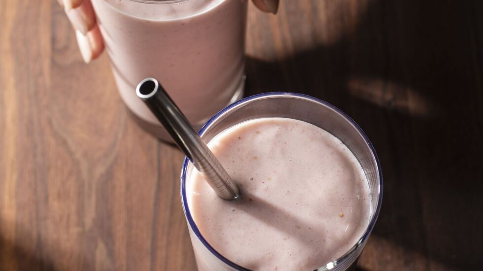 Add to blender: 1 1/4 cups plain low-fat yogurt, 2 cups strawberries, 1 small banana, peeled and halved, 4 teaspoons almond or peanut butter or 2 tablespoons hemp seed hearts.