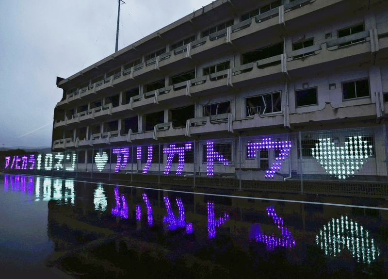 The glowing messages appear on a fence in front of a building that is part of the Ruins of the Great East Japan Earthquake Kesennuma City Memorial Museum, a structure connected to a building that was actually destroyed in the disaster.
