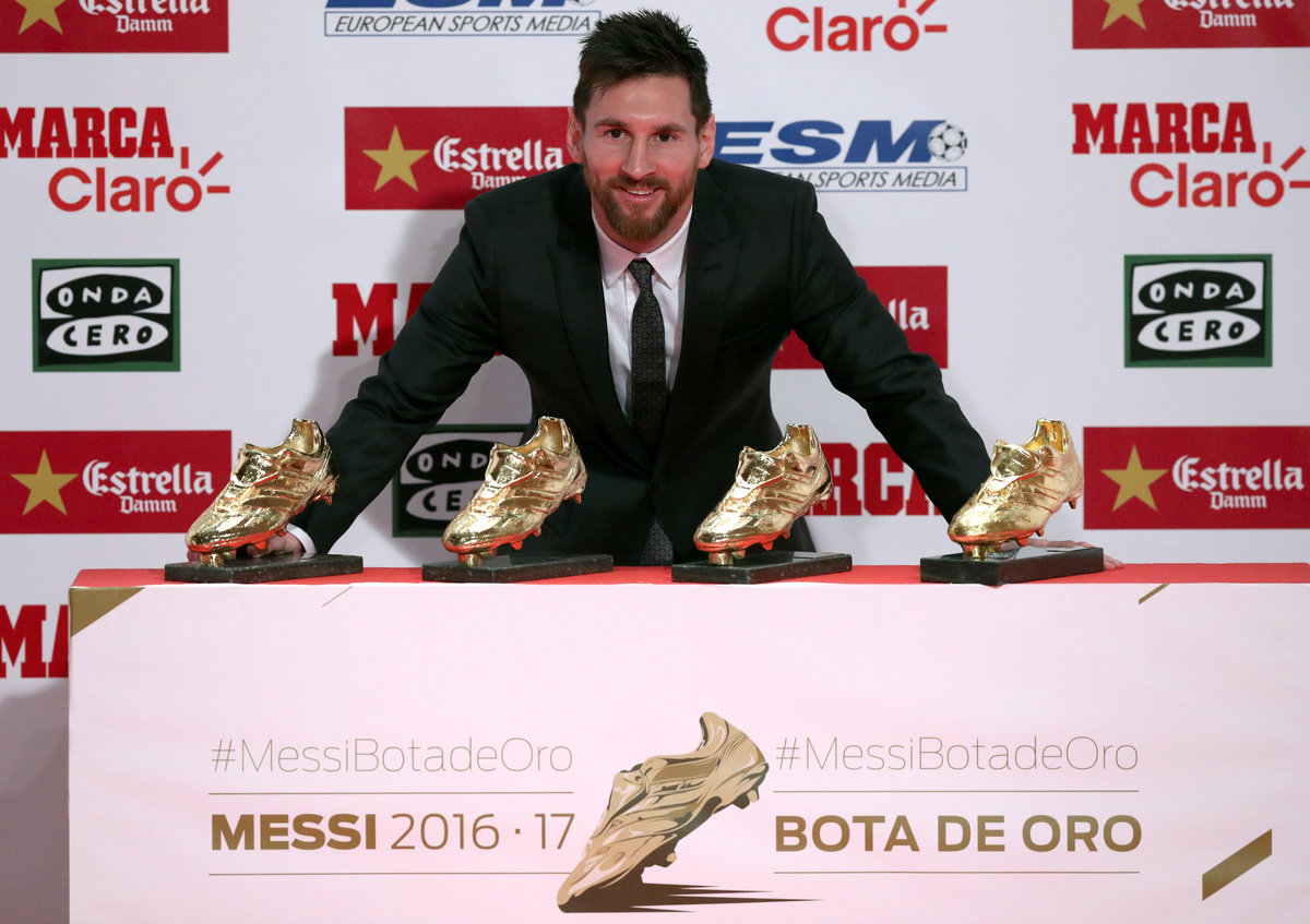 Messi received the European Sports Media Golden Shoe for the fourth time in his career after hitting 37 league goals last season, collecting it from his team mate Luis Suarez, who won it last year with 40.