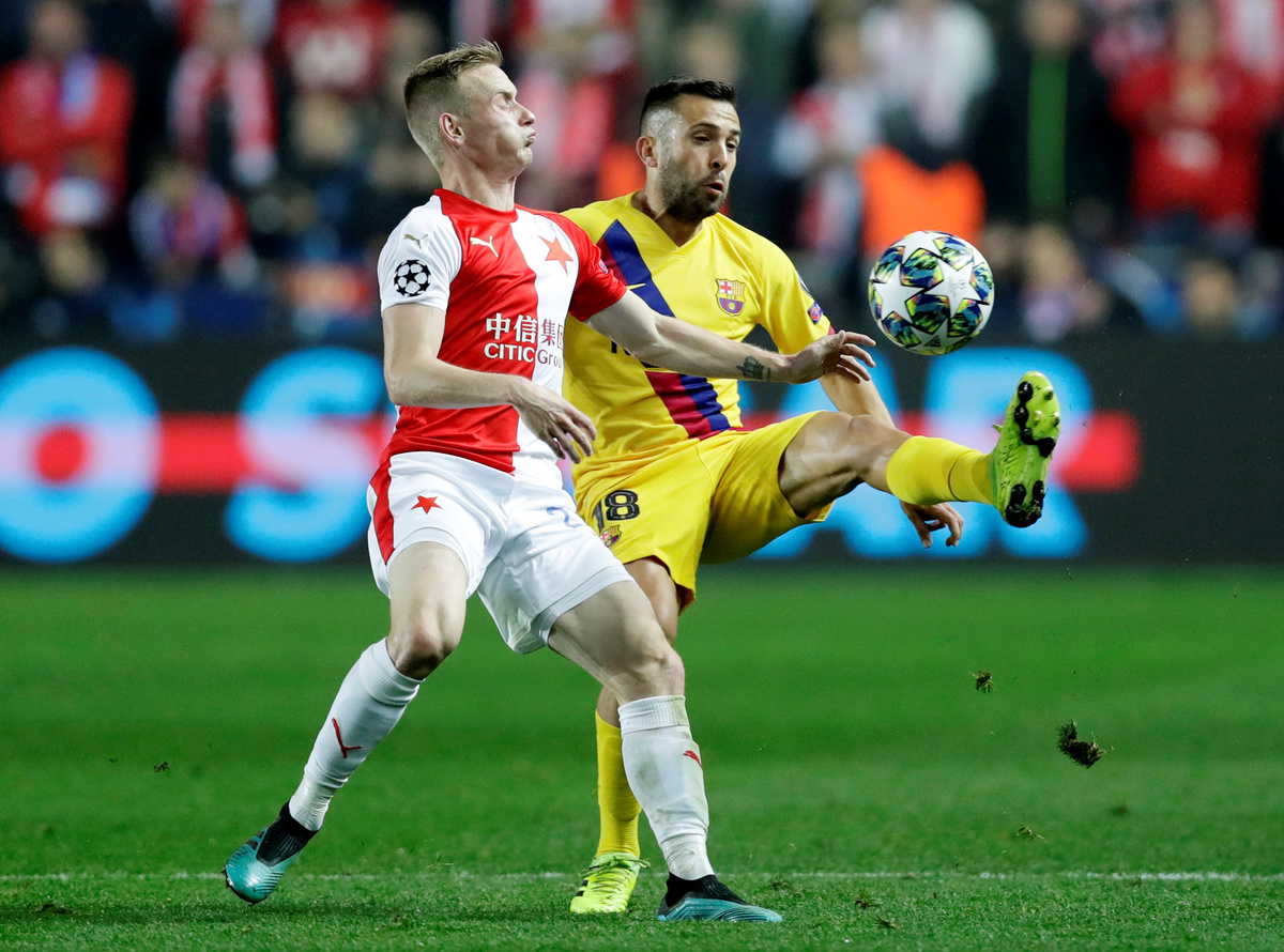 Soccer Football - Champions League - Group F - SK Slavia Prague v FC Barcelona - Eden Arena, Prague, Czech Republic - October 23, 2019 SK Slavia Prague's Petr Sevcik in action with Barcelona's Jordi Alba REUTERS/David W Cerny