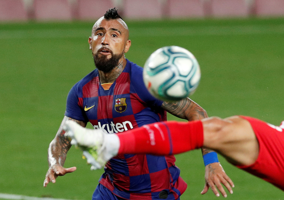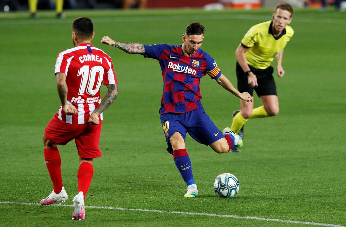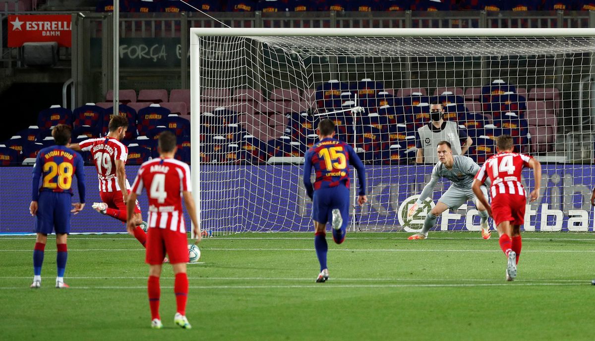 Soccer Football - La Liga Santander - FC Barcelona v Atletico Madrid - Camp Nou, Barcelona, Spain - June 30, 2020 Barcelona's Arturo Vidal in action with Atletico Madrid's Felipe, as play resumes behind closed doors following the outbreak of the coronavirus disease (COVID-19) REUTERS/Albert GeaSoccer Football - La Liga Santander - FC Barcelona v Atletico Madrid - Camp Nou, Barcelona, Spain - June 30, 2020 Barcelona's Lionel Messi celebrates scoring their second goal, as play resumes behind closed doors following the outbreak of the coronavirus disease (COVID-19) REUTERS/Albert GeaSoccer Football - La Liga Santander - FC Barcelona v Atletico Madrid - Camp Nou, Barcelona, Spain - June 30, 2020 Atletico Madrid's Diego Costa shoots at goal from the penalty spot, as play resumes behind closed doors following the outbreak of the coronavirus disease (COVID-19) REUTERS/Albert Gea