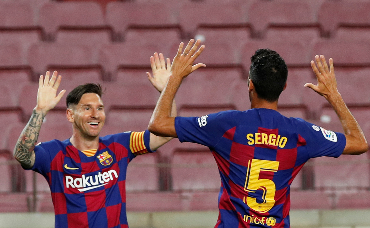 Soccer Football - La Liga Santander - FC Barcelona v Atletico Madrid - Camp Nou, Barcelona, Spain - June 30, 2020 Barcelona's Lionel Messi and Sergio Busquets celebrate an own goal scored by Atletico Madrid's Diego Costa and the first for Barcelona, as play resumes behind closed doors following the outbreak of the coronavirus disease (COVID-19) REUTERS/Albert Gea