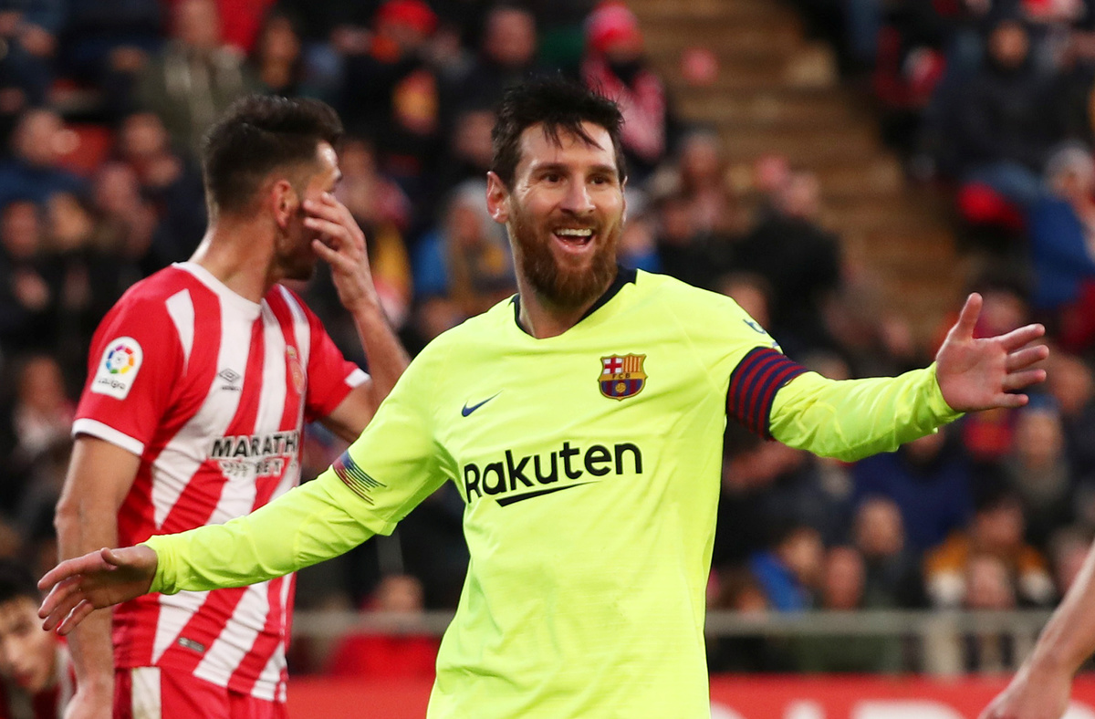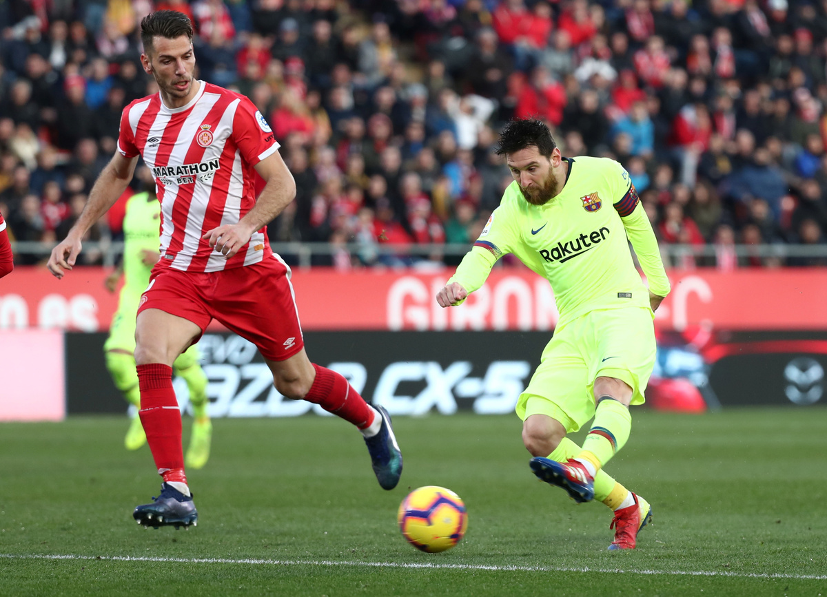 GIRONA, Spain (Reuters) - An insatiable Lionel Messi scored for the eighth game in a row in all competitions as La Liga champions Barcelona saw off a gutsy Girona side 2-0 in a Catalan derby on Sunday to go five points clear at the top of the standings.
