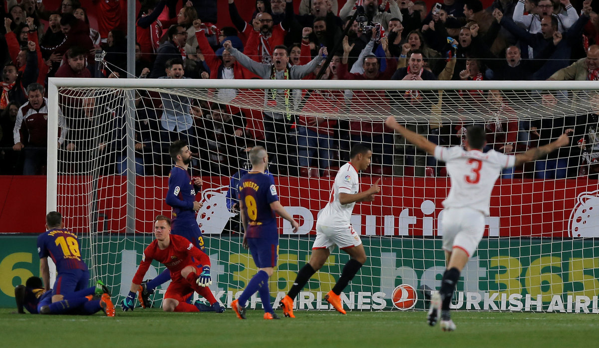 Soccer Football - La Liga Santander - Sevilla vs Barcelona - Ramon Sanchez Pizjuan, Seville, Spain - March 31, 2018 Sevilla's Joaquin Correa celebrates with Sergio Escudero after Luis Muriel scores their second goal as Barcelona's Ivan Rakitic and teammates look dejected REUTERS/Jon NazcaSoccer Football - La Liga Santander - Sevilla vs Barcelona - Ramon Sanchez Pizjuan, Seville, Spain - March 31, 2018 Barcelona's Samuel Umtiti in action with Sevilla's Sergio Rico REUTERS/Jon NazcaSoccer Football - La Liga Santander - Sevilla vs Barcelona - Ramon Sanchez Pizjuan, Seville, Spain - March 31, 2018 Sevilla's Luis Muriel celebrates scoring their second goal REUTERS/Jon NazcaSoccer Football - La Liga Santander - Sevilla vs Barcelona - Ramon Sanchez Pizjuan, Seville, Spain - March 31, 2018 Barcelona's Luis Suarez celebrates scoring their first goal REUTERS/Jon NazcaSoccer Football - La Liga Santander - Sevilla vs Barcelona - Ramon Sanchez Pizjuan, Seville, Spain - March 31, 2018 Barcelona's Lionel Messi celebrates scoring their second goal with Jordi Alba REUTERS/Jon Nazca