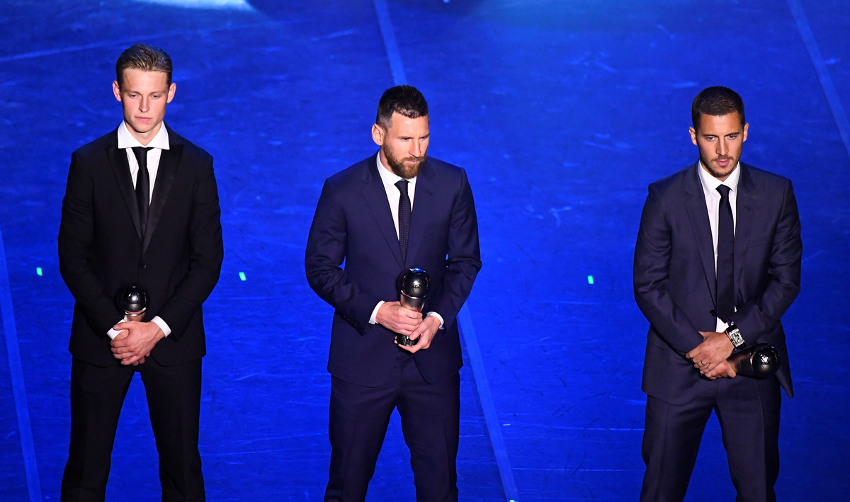 Soccer Football - The Best FIFA Football Awards - Teatro alla Scala, Milan, Italy - September 23, 2019 FC Barcelona's Frenkie de Jong, Lionel Messi and Real Madrid's Eden Hazard line up on stage as part of the FIFA FIFPro Men's world eleven players during the awards REUTERS/Flavio Lo Scalzo