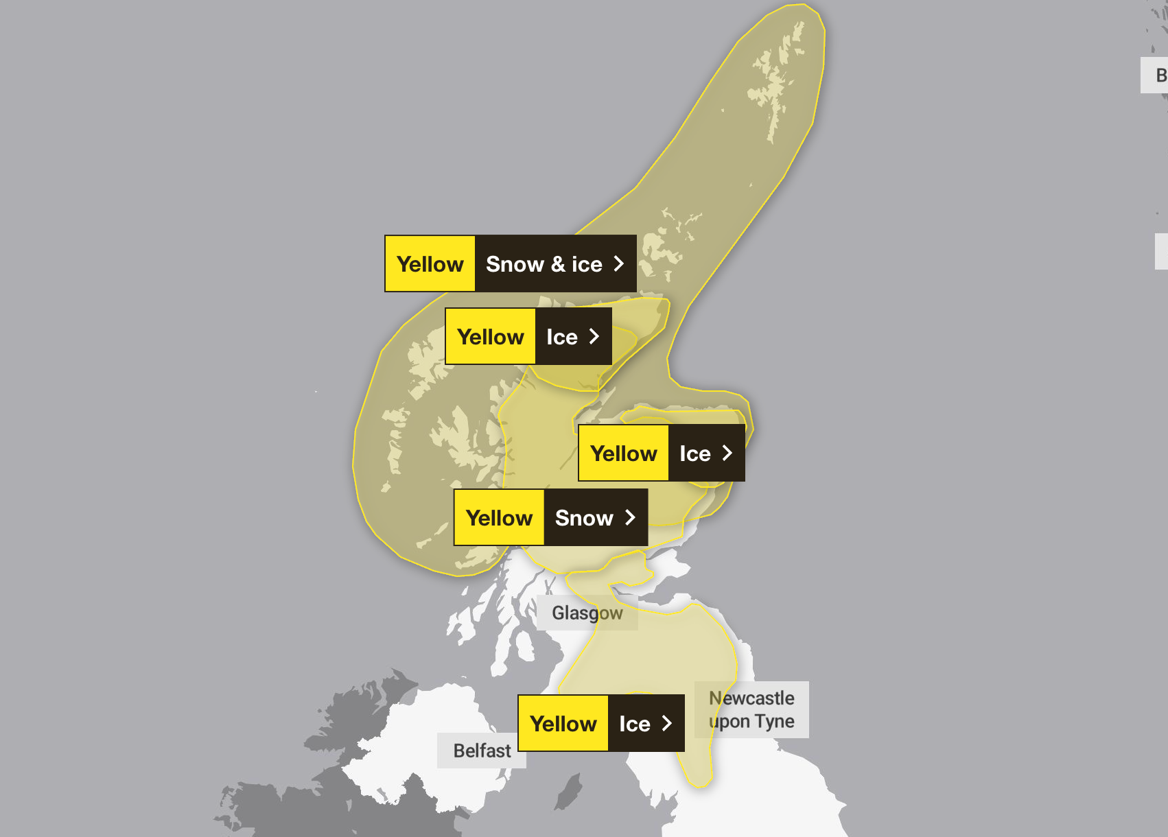Widespread frosts are forecast across the country, with the Met Office announcing yellow ice warnings from 7pm on Monday in areas in the North East and far north of mainland Scotland. Overnight showers and low temperatures bring a risk of icy conditions on roads and pavements.