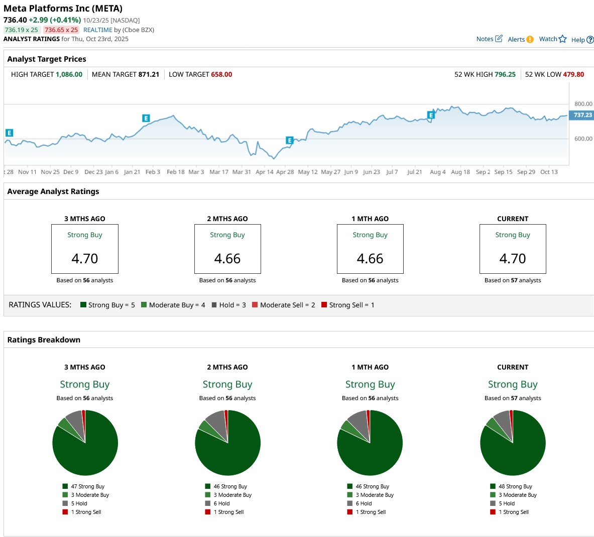 Out of the 57 analysts covering META stock, 48 recommend “Strong Buy,” three recommend “Moderate Buy,” five recommend “Hold,” and one recommends “Strong Sell.” The average META stock price target is $871.21, above the current price of about $736.