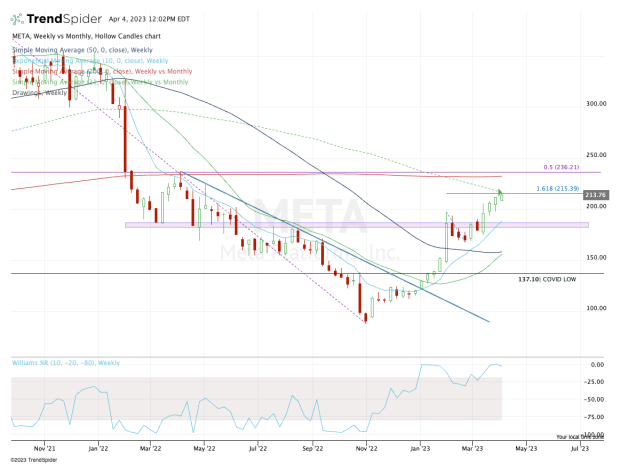 Meta stock is running into the declining 21-month moving average and the 161.8% upside extension from the prior pullback in February.