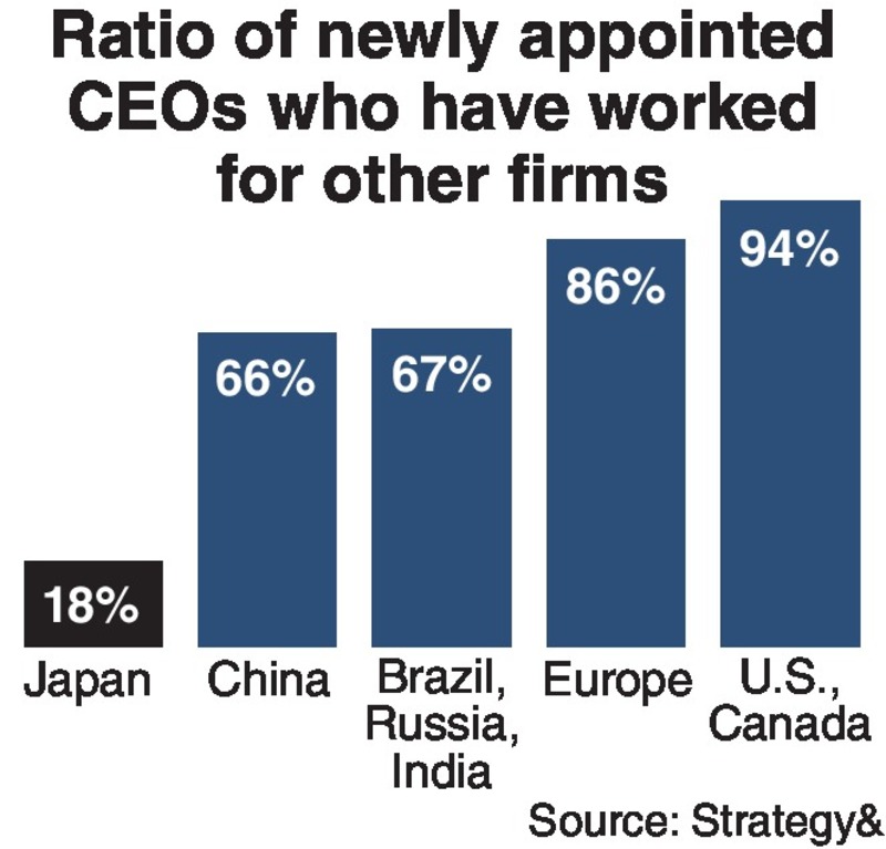 According to consulting firm Strategy&, only 18% of newly appointed chief executive officers of Japanese companies have spent part of their careers at other companies.