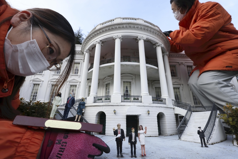 U.S. President Donald Trump was cleaned with a cotton swab, while the White House was dusted off with a brush, on Monday at Tobu World Square theme park, which features famous buildings and monuments from around the world in miniature.