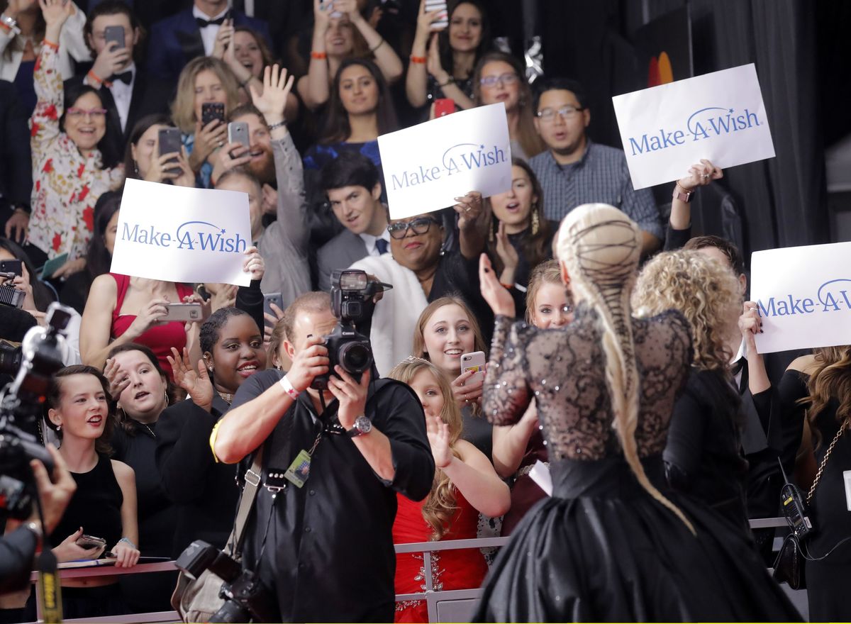 On the red carpet, dozens of musicians wore or held white roses to support women's equality and freedom from sexual harassment, a theme echoed on stage in an emotional performance by pop singer Kesha of her single "Praying."