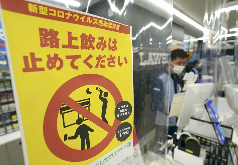 At a Lawson outlet in Shibuya Ward, Tokyo, on Friday, a message asking customers to stop drinking outdoors was displayed on cash register screens when they bought alcohol. The store also played in-store announcements asking customers not to drink on the street or in parks.