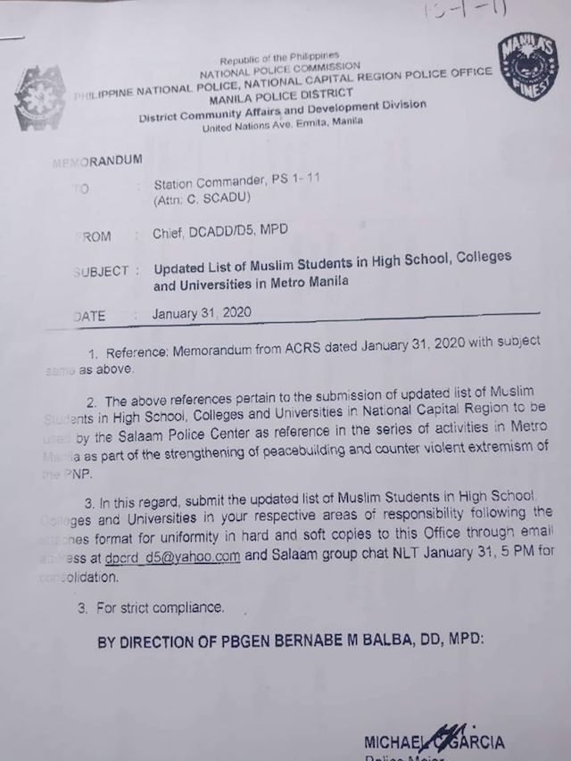 In a memorandum signed by a certain Police Major Michael Garcia dated January 31, 2020, a police station was ordered to submit an “updated list of Muslim Students in High School, Colleges, and Universities" as part of a broader effort in the entire National Capital Region.
