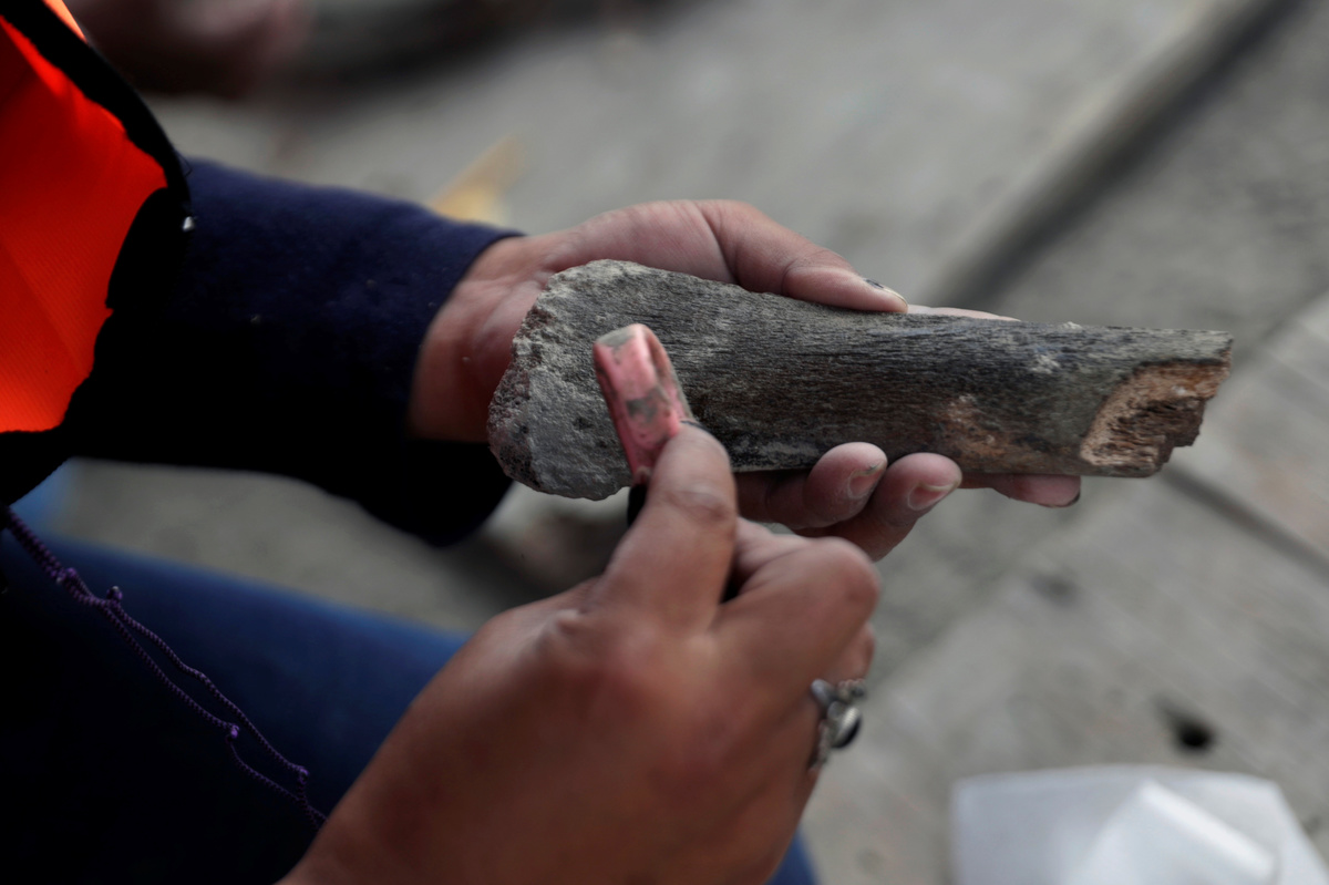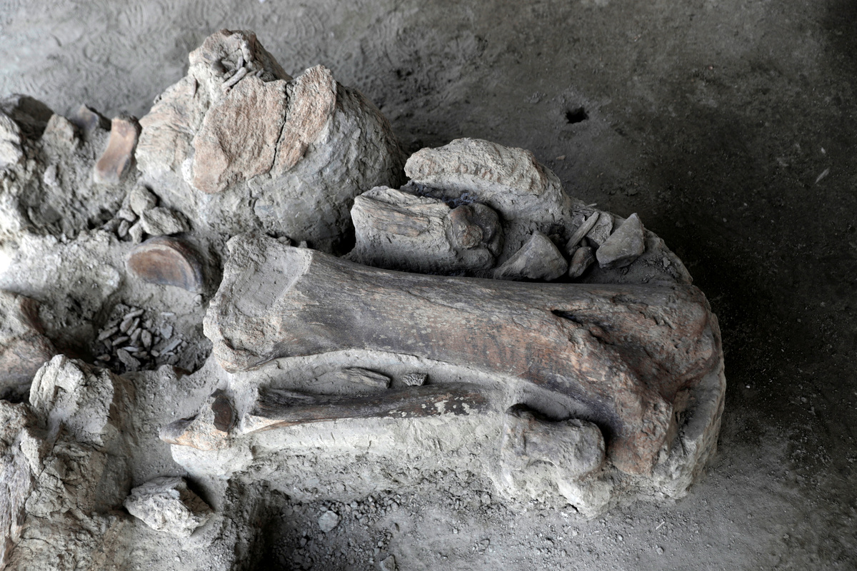 Mammoth bones are pictured at a site where archaeologists and workers of Mexico's National Institute of Anthropology and History (INAH) work and where more than 100 mammoth skeletons have been identified, along with a mix of other ice age mammals, at an area where a new international airport is currently being built, in Zumpango, near Mexico City, Mexico September 8, 2020. REUTERS/Henry Romero