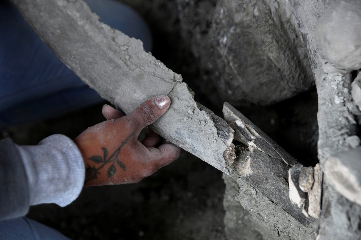 A worker of Mexico's National Institute of Anthropology and History (INAH) works at a site where more than 100 mammoth skeletons have been identified, along with a mix of other ice age mammals, at an area where a new international airport is currently being built, in Zumpango, near Mexico City, Mexico September 8, 2020. REUTERS/Henry Romero