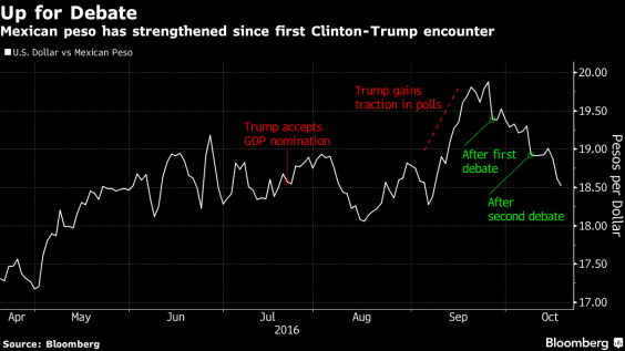 The peso, already trading higher against the US dollar following Trump's drop in the polls over the past weeks, received another boost at the end of the debate, rising to a peak of 18.455 pesos against the US dollar.