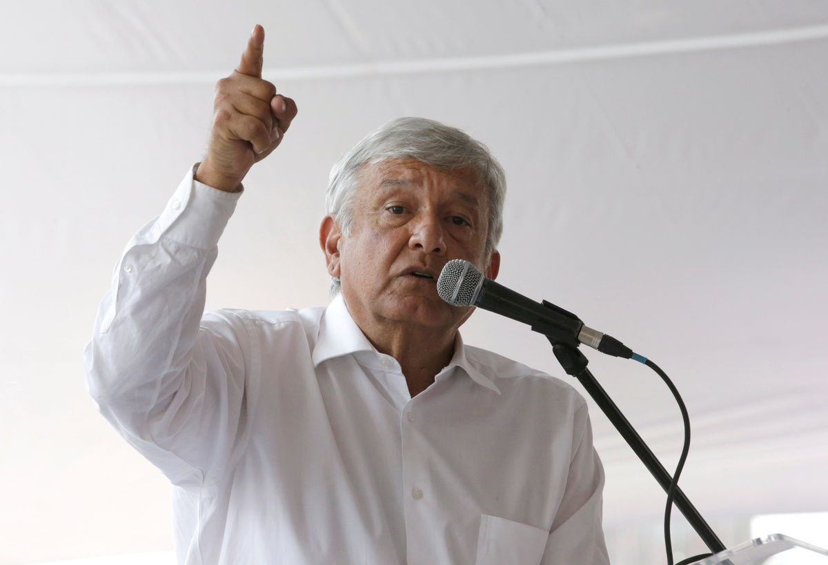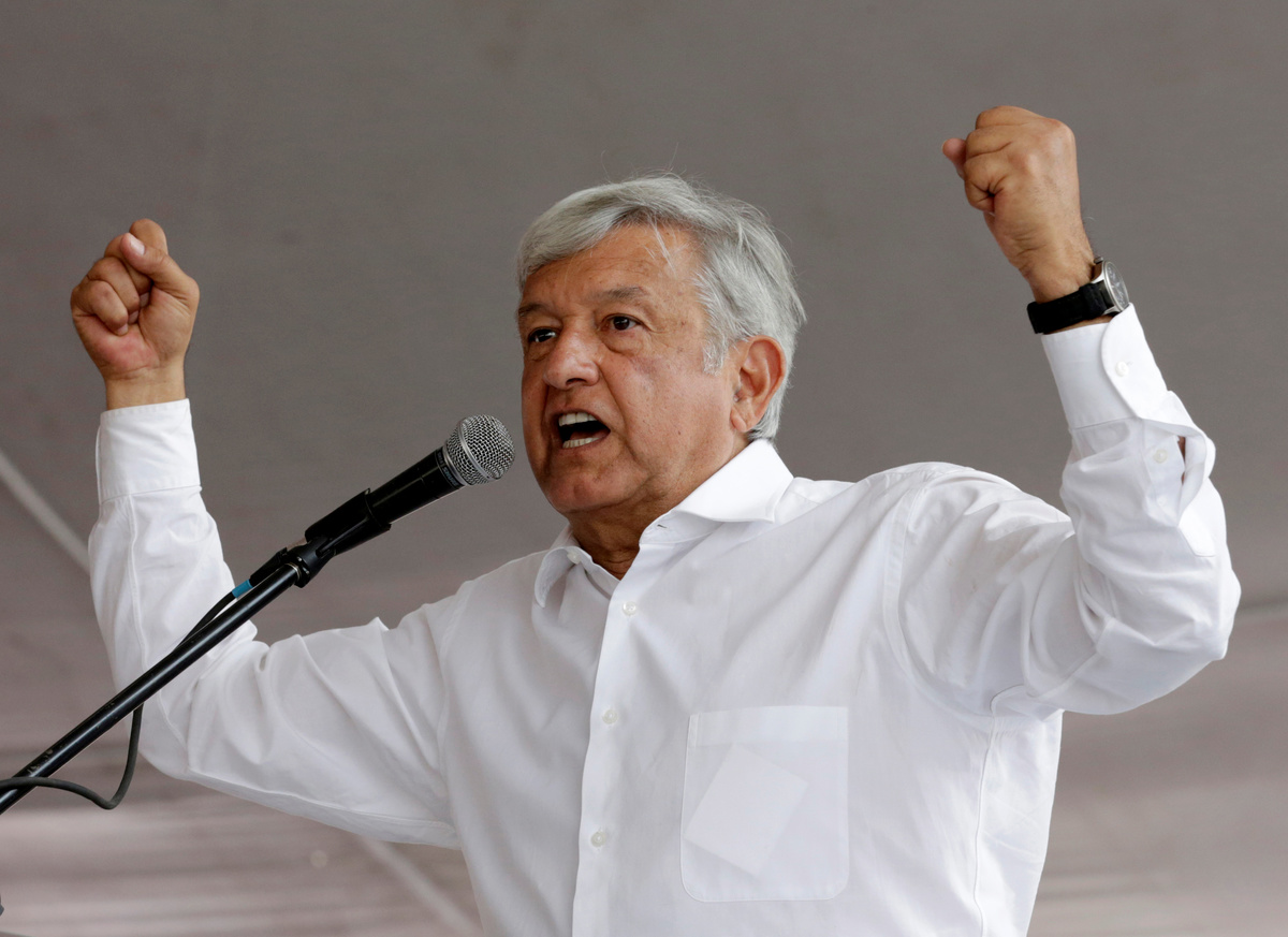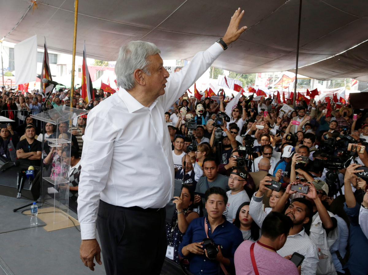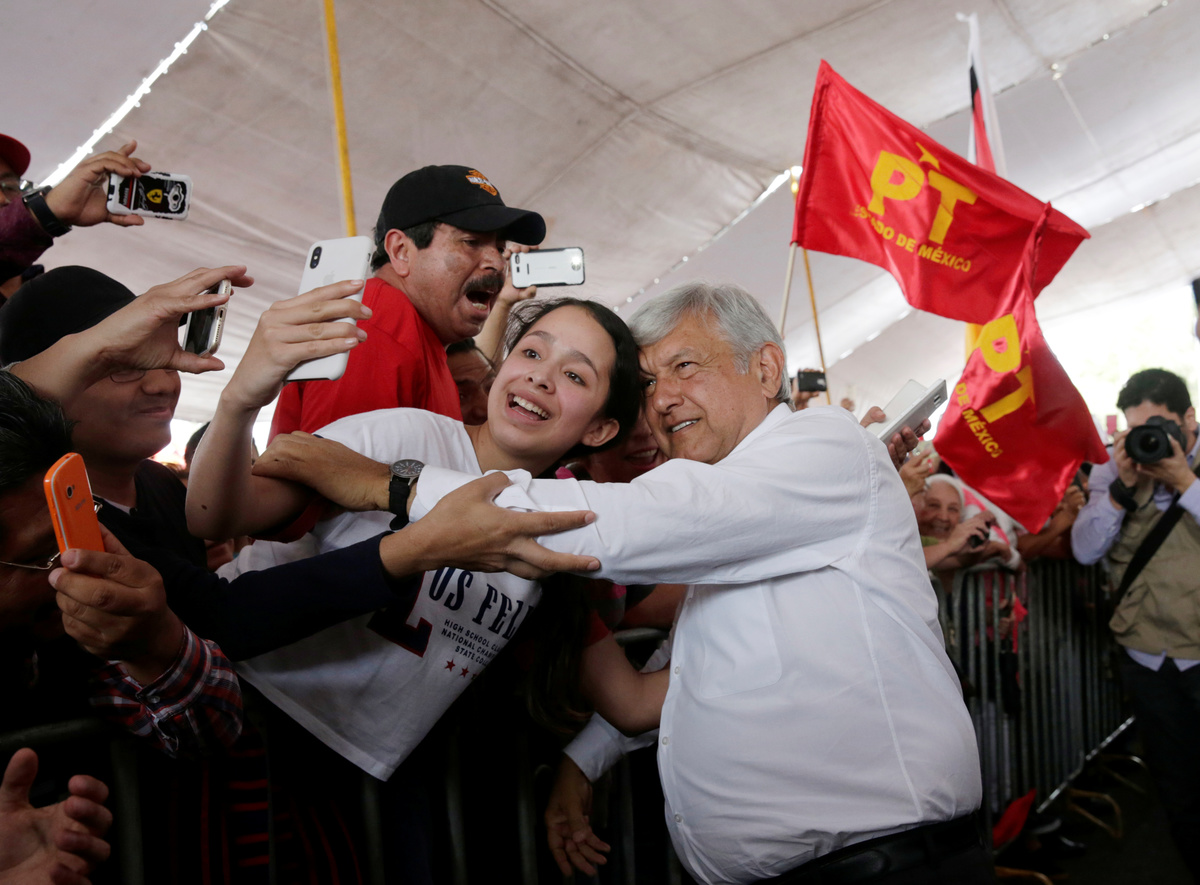 Leftist front-runner Andres Manuel Lopez Obrador of the National Regeneration Movement (MORENA) greets supporters during his campaign rally in Cuautitlan Izcalli, Mexico, April 13, 2018. REUTERS/Henry RomeroA supporter holds a figure of leftist front-runner Andres Manuel Lopez Obrador of the National Regeneration Movement (MORENA), as she takes part in his campaign rally in Cuautitlan Izcalli, Mexico, April 13, 2018. REUTERS/Henry RomeroLeftist front-runner Andres Manuel Lopez Obrador of the National Regeneration Movement (MORENA) poses for a selfie with a supporter during his campaign rally in Cuautitlan Izcalli, Mexico, April 13, 2018. REUTERS/Henry Romero