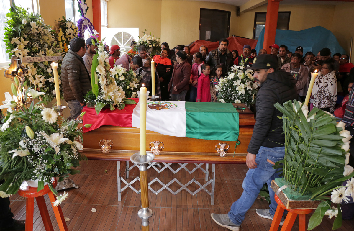 Relatives and friends gather around the coffin of environmental activist Homero Gomez, who fought to protect the famed monarch butterfly and was found dead two weeks after he disappeared, during his funeral service in the western Mexican state of Michoacan, Mexico January 30, 2020. REUTERS/Alan Ortega