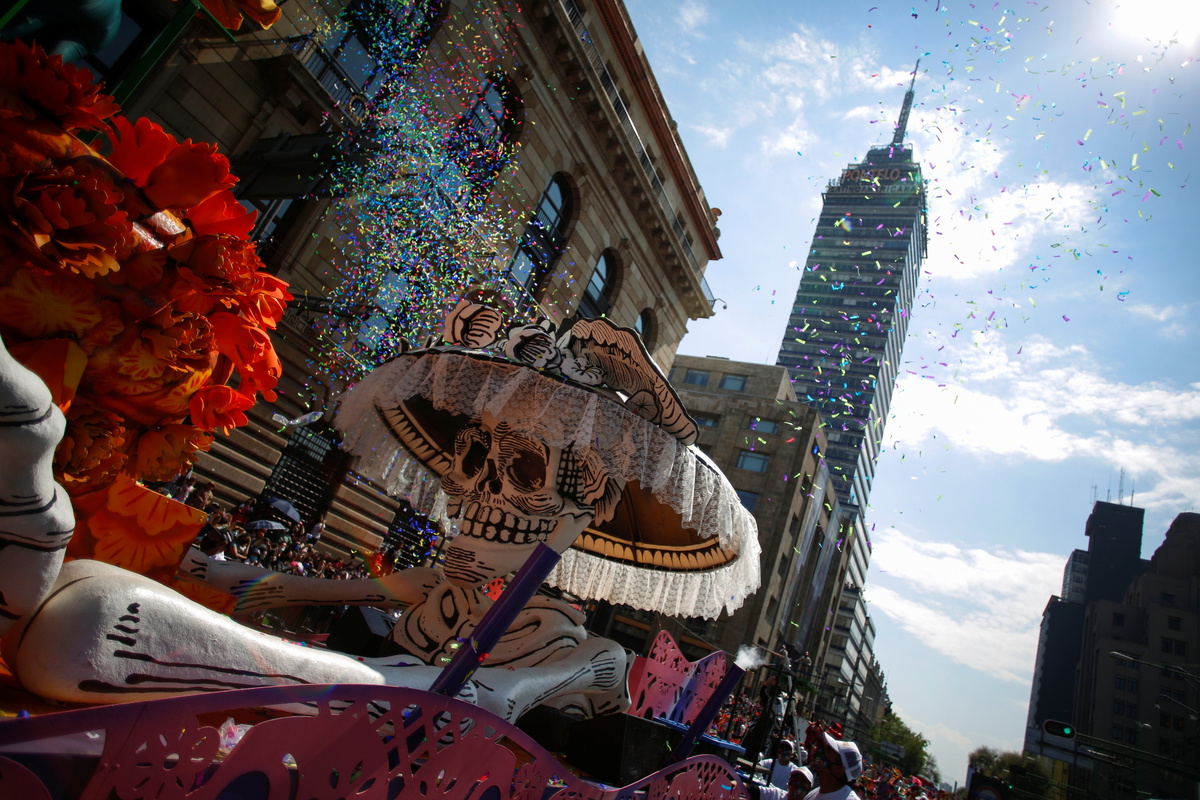 Children sat atop their parents' shoulders to catch sight of the procession of floats bearing dancers in indigenous attire and feathered headdresses, scaled-down reproductions of Mexico City landmarks and spectral figures.