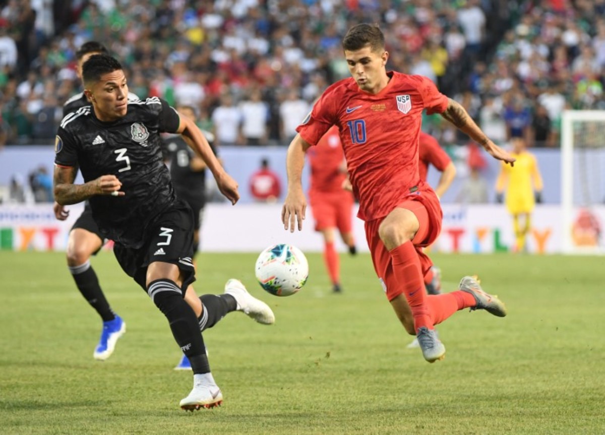 Jul 7, 2019; Chicago, IL, USA; United States midfielder Christian Pulisic (10) is chased by Mexico defender Luis Rodriguez (21) in the first half championship match of the CONCACAF Gold Cup soccer tournament at Soldier Field. Mike DiNovo-USA TODAY Sports
