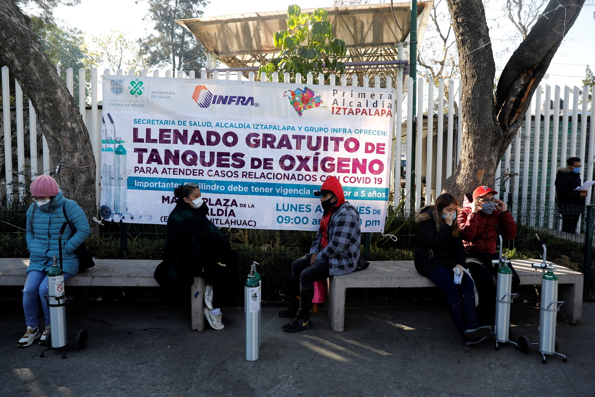 People wait in a queue to fill oxygen tanks for relatives infected with the coronavirus disease (COVID-19), at a free rechargeable oxygen stand provided by the government in Mexico City, Mexico January 6, 2021. REUTERS/Carlos Jasso