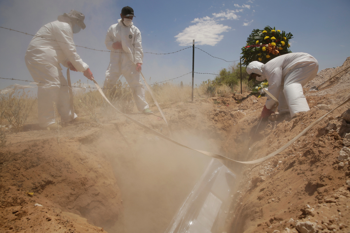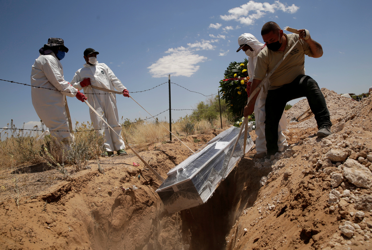 Cemetery workers place a coffin, containing the body of a 52-year old woman who died of the coronavirus disease (COVID-19), into a grave at the San Rafael cemetery, in Ciudad Juarez, Mexico May 19, 2020. REUTERS/Jose Luis Gonzalez
