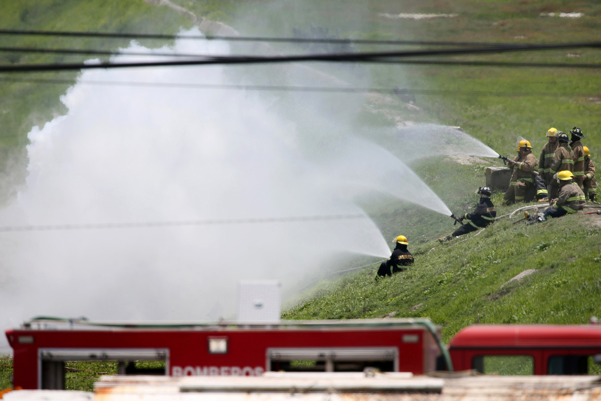 Firefighters hose down near the area where a gas leak caused an evacuation in Nextlalpan municipality, in Mexico state, Mexico August 2, 2019. REUTERS/Edgard Garrido