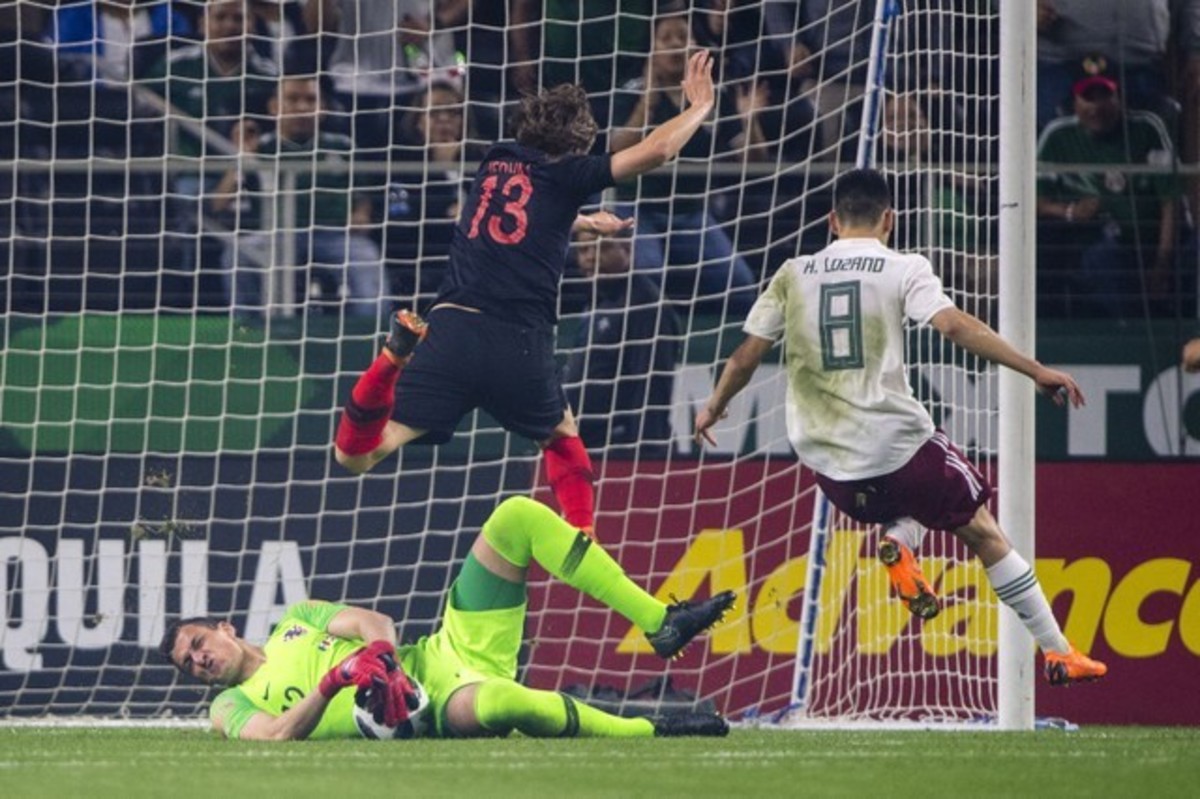 Mar 27, 2018; Arlington, TX, USA; Croatia goalkeeper Lovre Kalinic (12) makes a save as defender Tin Jedvaj (13) and Mexico midfielder Hirving Lozano (8) leap out of way during the second half at AT&T Stadium. Mandatory Credit: Jerome Miron-USA TODAY Sports
