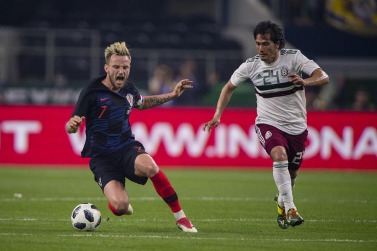Mar 27, 2018; Arlington, TX, USA; Croatia midfielder Ivan Rakitic (7) is tripped up by Mexico midfielder Jorge Hernández (24) during the second half at AT&T Stadium. Mandatory Credit: Jerome Miron-USA TODAY Sports