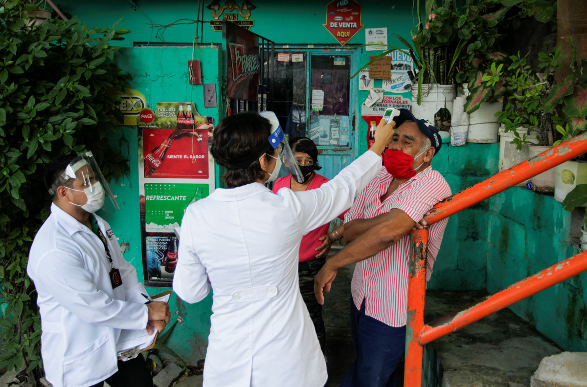 A healthcare worker checks the temperature of a man during a house by house walk to test people for the coronavirus disease (COVID-19), in Monterrey, Mexico August 5, 2020. REUTERS/Daniel Becerril