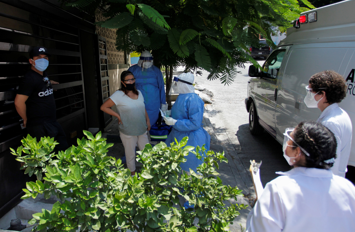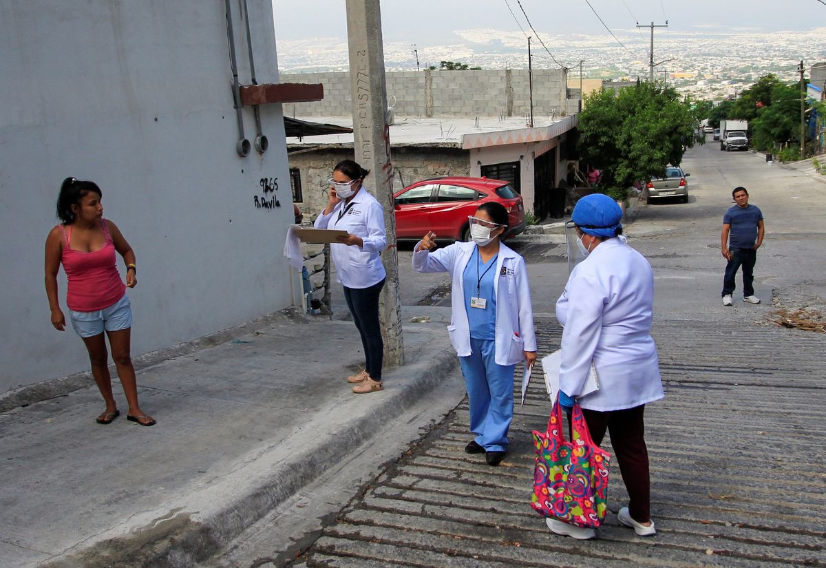 Healthcare workers speak with a woman before transporting her in an ambulance during a house by house walk to test people for the coronavirus disease (COVID-19), in Monterrey, Mexico August 5, 2020. REUTERS/Daniel BecerrilA healthcare worker speaks with a woman during a house by house walk to test people for the coronavirus disease (COVID-19), in Monterrey, Mexico August 5, 2020. REUTERS/Daniel BecerrilHealthcare workers speak with a woman during a house by house walk to test people for the coronavirus disease (COVID-19), in Monterrey, Mexico August 5, 2020. REUTERS/Daniel Becerril