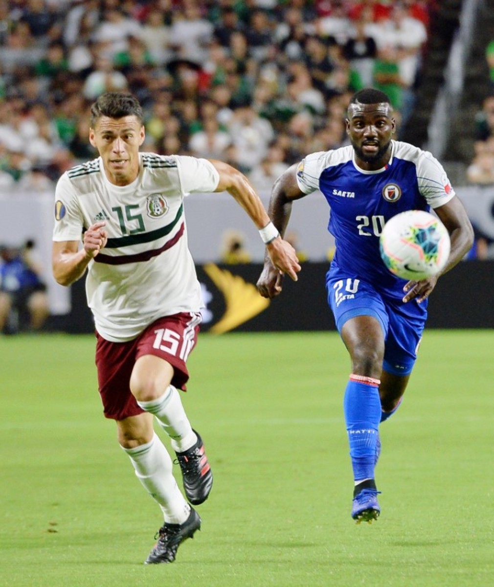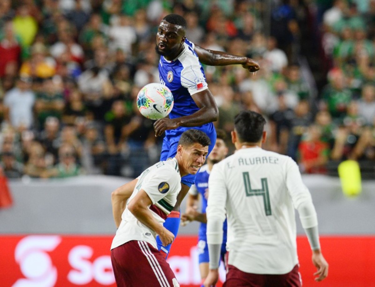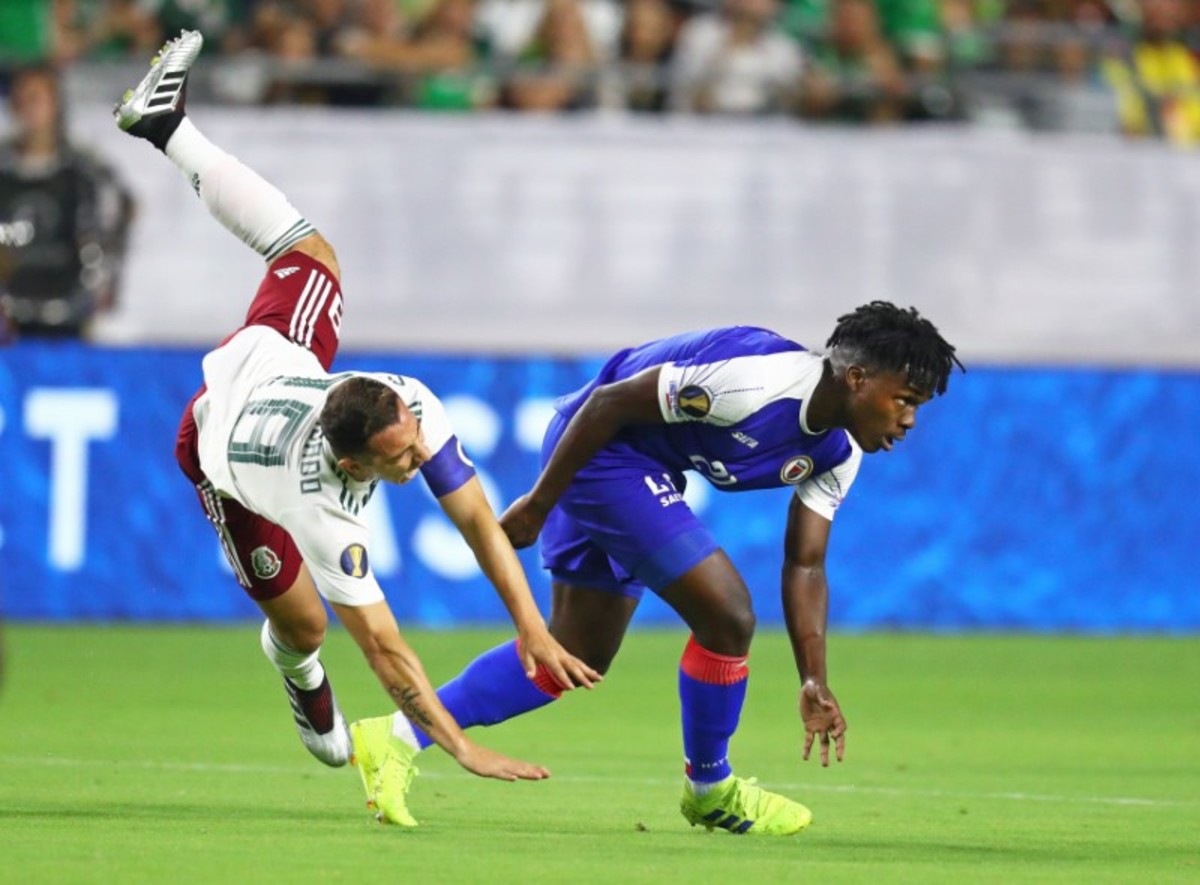 Jul 2, 2019; Glendale, AZ, USA; Mexico midfielder Andres Guardado (left) reacts as he is upended by Haiti midfielder Bryan Alceus during semi-final play in the CONCACAF Gold Cup soccer tournament at State Farm Stadum. Alceus would receive a yellow card on the play. Mandatory Credit: Mark J. Rebilas-USA TODAY SportsJul 2, 2019; Glendale, AZ, USA; Mexico defender Edson Alvarez (4) heads the ball against the Haiti during the first half of semi-final play in the CONCACAF Gold Cup soccer tournament at State Farm Stadum. Mandatory Credit: Joe Camporeale-USA TODAY SportsJul 2, 2019; Glendale, AZ, USA; Haiti forward Duckens Nazon (9) shoots the ball by Mexico defender Edson Alvarez (4) during the first half of semi-final play in the CONCACAF Gold Cup soccer tournament at State Farm Stadum. Mandatory Credit: Joe Camporeale-USA TODAY SportsJul 2, 2019; Glendale, AZ, USA; Haiti midfielder Bryan Alceus (21) moves the ball by Mexico defender Edson Alvarez (4) during the first half of semi-final play in the CONCACAF Gold Cup soccer tournament at State Farm Stadum. Mandatory Credit: Joe Camporeale-USA TODAY SportsJul 2, 2019; Glendale, AZ, USA; Haiti forward Frantzdy Pierrot (20) heads the ball by Mexico defender Hector Moreno (15) during the first half of semi-final play in the CONCACAF Gold Cup soccer tournament at State Farm Stadum. Mandatory Credit: Joe Camporeale-USA TODAY SportsJul 2, 2019; Glendale, AZ, USA; Mexico defender Hector Moreno (15) and Haiti forward Frantzdy Pierrot (20) go after the ball during the first half of semi-final play in the CONCACAF Gold Cup soccer tournament at State Farm Stadum. Mandatory Credit: Joe Camporeale-USA TODAY SportsJul 2, 2019; Glendale, AZ, USA; Mexico players huddle prior the first half of semi-final play in the CONCACAF Gold Cup soccer tournament against Haiti at State Farm Stadum. Mandatory Credit: Joe Camporeale-USA TODAY SportsJul 2, 2019; Glendale, AZ, USA; Mexico forward Rodolfo Pizarro (right) controls the ball against Haiti midfielder Steeven Saba in the first half during semi-final play in the CONCACAF Gold Cup soccer tournament at State Farm Stadum. Mandatory Credit: Mark J. Rebilas-USA TODAY SportsJul 2, 2019; Glendale, AZ, USA; Mexico forward Rodolfo Pizarro reacts after being upended against Haiti in the first half during semi-final play in the CONCACAF Gold Cup soccer tournament at State Farm Stadum. Mandatory Credit: Mark J. Rebilas-USA TODAY SportsJul 2, 2019; Glendale, AZ, USA; Mexico forward Rodolfo Pizarro (right) controls the ball against Haiti midfielder Steeven Saba in the first half during semi-final play in the CONCACAF Gold Cup soccer tournament at State Farm Stadum. Mandatory Credit: Mark J. Rebilas-USA TODAY SportsJul 2, 2019; Glendale, AZ, USA; Mexico forward Raul Jimenez (9) celebrates after scoring a goal against Haiti during the first extra time period of semi-final play in the CONCACAF Gold Cup soccer tournament at State Farm Stadum. Mandatory Credit: Joe Camporeale-USA TODAY SportsREFILE - UPDATING SLUG Haitians watch a television broadcast of the match between Haiti and Mexico during the semi-final of the CONCACAF Gold Cup soccer tournament, at a street in Petion Ville, Port-au-Prince, Haiti July 3, 2019. REUTERS/Andres Martinez CasaresJul 2, 2019; Glendale, AZ, USA; Soccer fans cheer prior to the first half of semi-final play in the CONCACAF Gold Cup soccer tournament at State Farm Stadum. Mandatory Credit: Joe Camporeale-USA TODAY SportsJul 2, 2019; Glendale, AZ, USA; A soccer fans cheer prior to the first half of semi-final play in the CONCACAF Gold Cup soccer tournament at State Farm Stadum. Mandatory Credit: Joe Camporeale-USA TODAY Sports