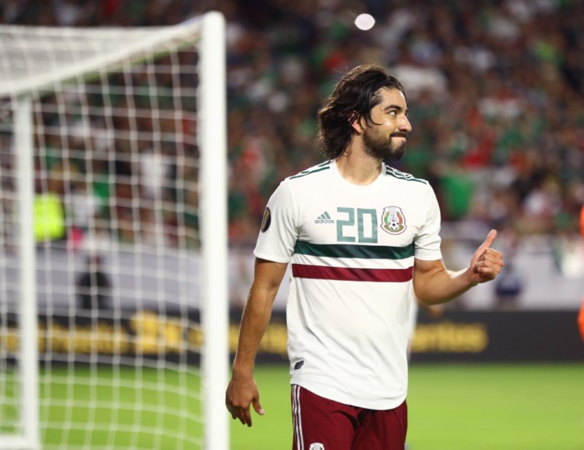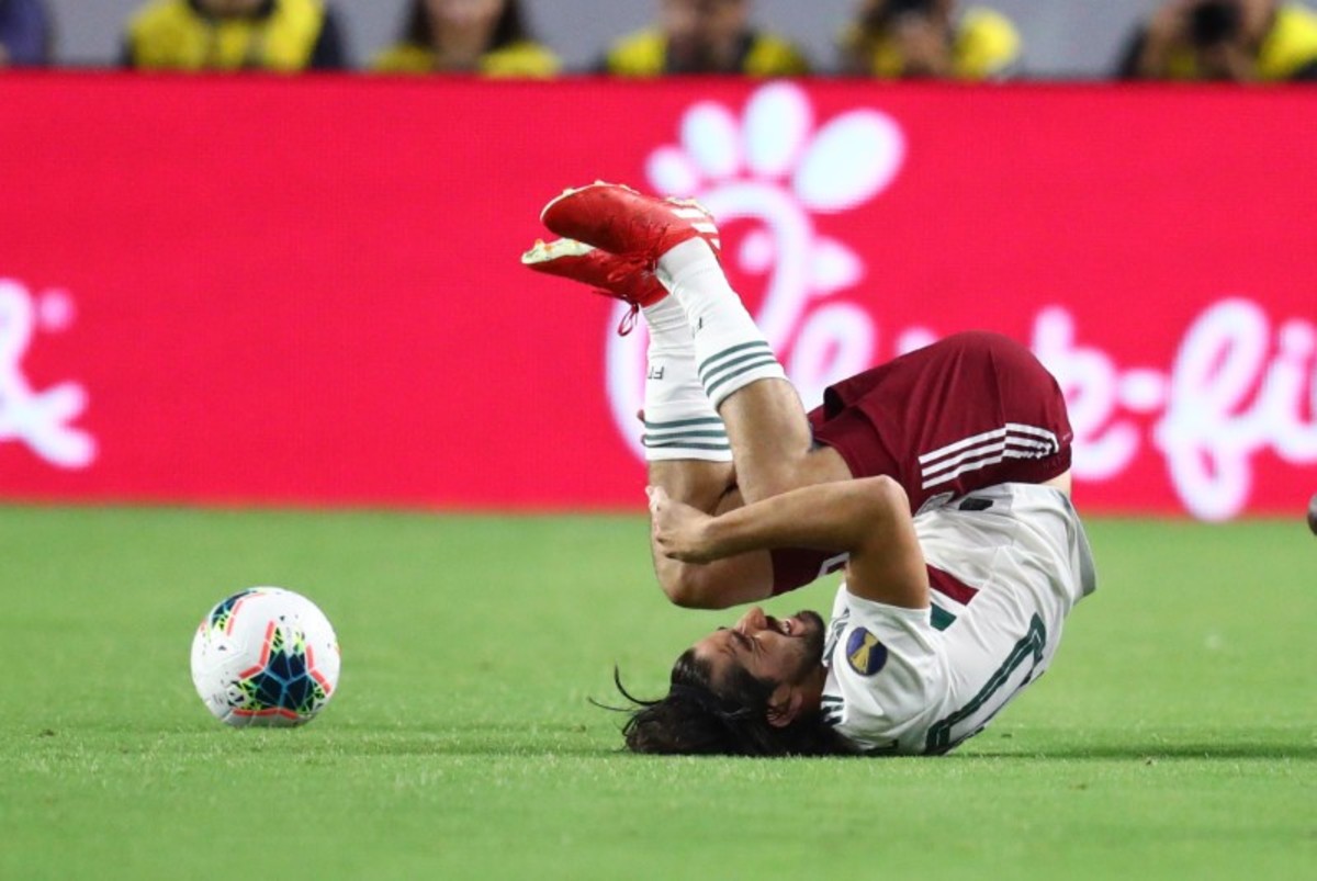 Jul 2, 2019; Glendale, AZ, USA; Mexico forward Rodolfo Pizarro reacts against Haiti in the first half during semi-final play in the CONCACAF Gold Cup soccer tournament at State Farm Stadum. Mandatory Credit: Mark J. Rebilas-USA TODAY Sports