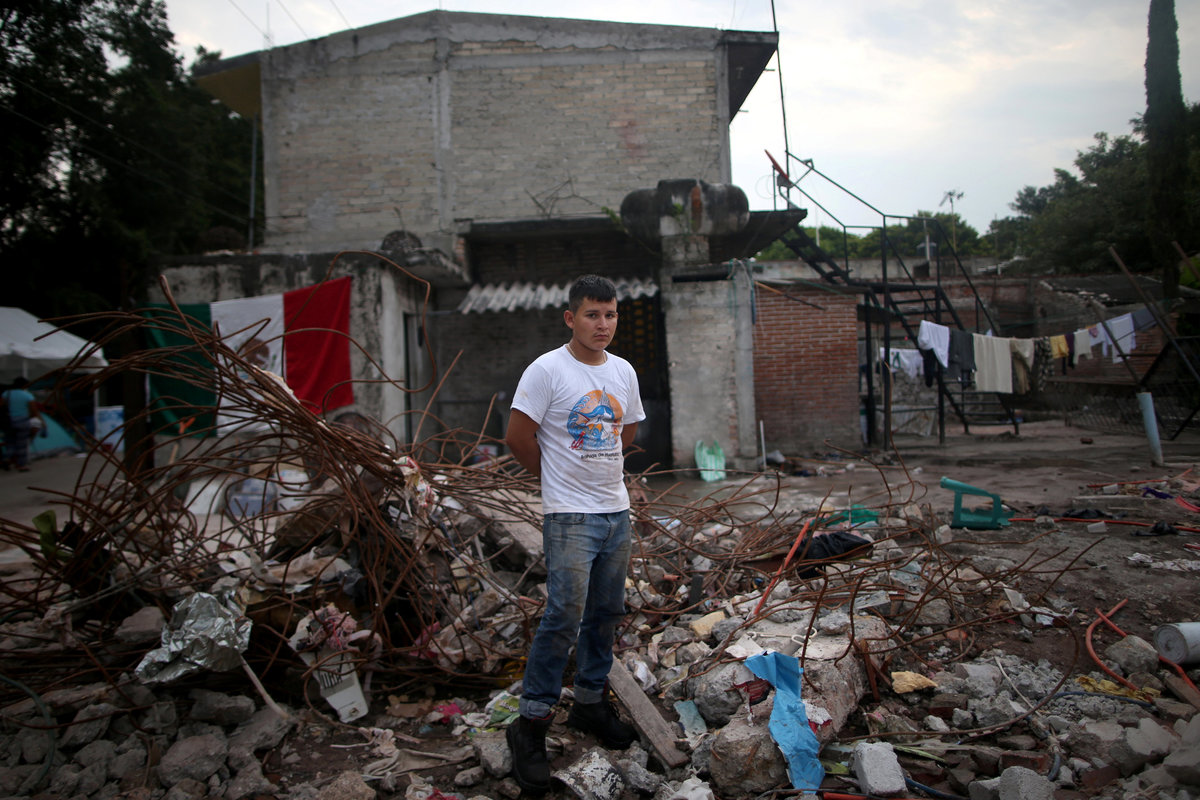 Rene Contreras, 20, a student, poses for a portrait on the rubble of his house after an earthquake in Jojutla de Juarez, Mexico, September 29, 2017. REUTERS/Edgard Garrido
