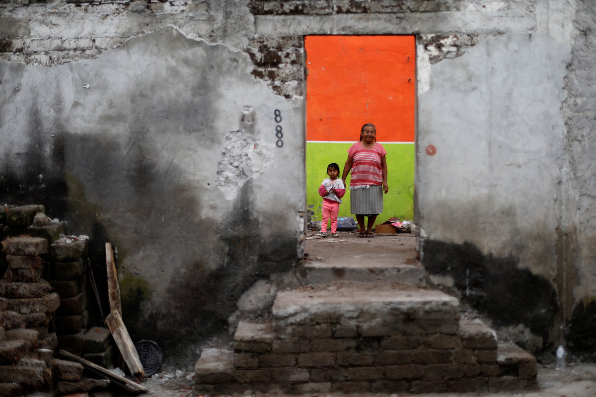 Elena Zapata, 69, a housewife, poses for a portrait with her granddaughter Mariana, 3, inside the ruins of her house after an earthquake in Tepalcingo, Mexico, September 29, 2017. REUTERS/Edgard Garrido
