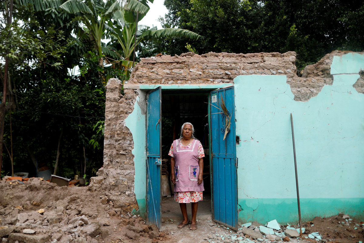 Catalina Martinez, 78, a housewife, poses for a portrait in the doorway of her house after an earthquake in San Jose Platanar, at the epicentre zone, Mexico, September 28, 2017. REUTERS/Edgard Garrido