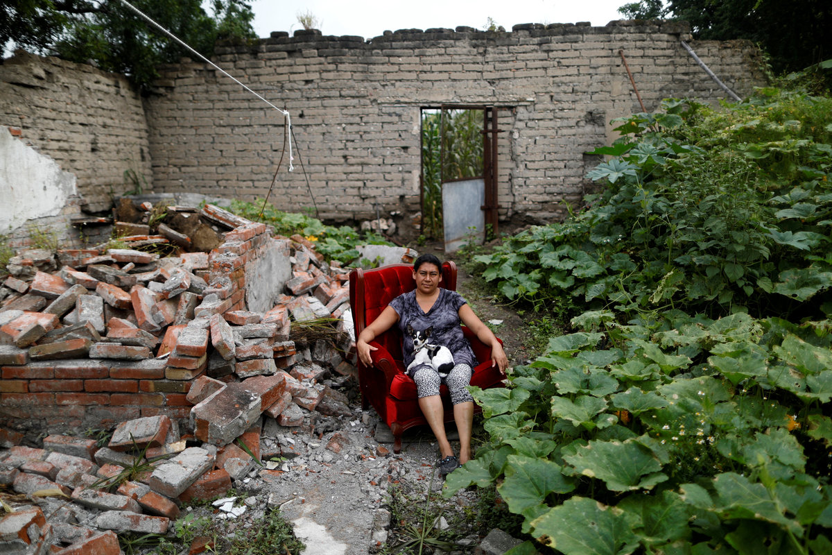 With its walls pulled down and the contents strewn outdoors, the house of 70-year-old housewife Maria Guzman in San Jose Platanar in Puebla state was left completely uninhabitable by the quake, forcing her into a shelter.