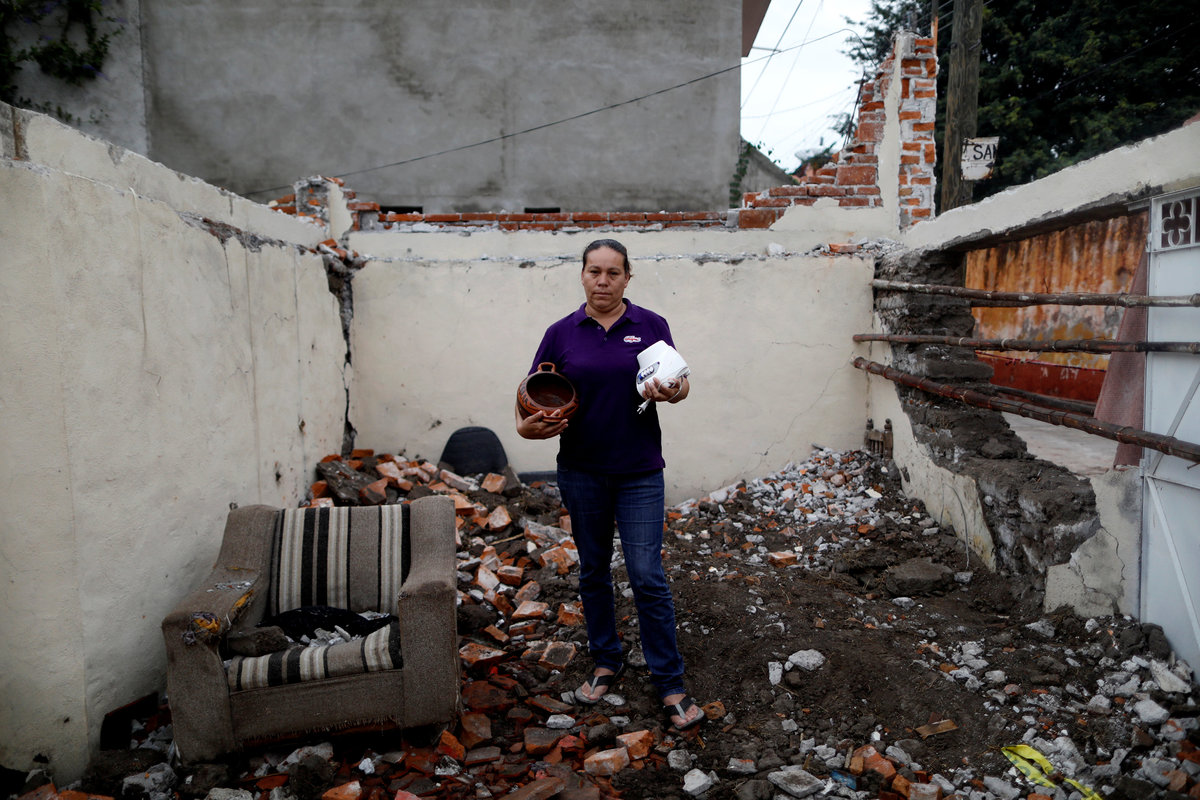 Ana Maria Hernandez, 37, a clothing salesperson, poses for a portrait outside her house as it is demolished after an earthquake in Jojutla de Juarez, Mexico, September 30, 2017. REUTERS/Edgard Garrido SEARCH "GARRIDO PORTRAIT" FOR THIS STORY. SEARCH "WIDER IMAGE" FOR ALL STORIES.