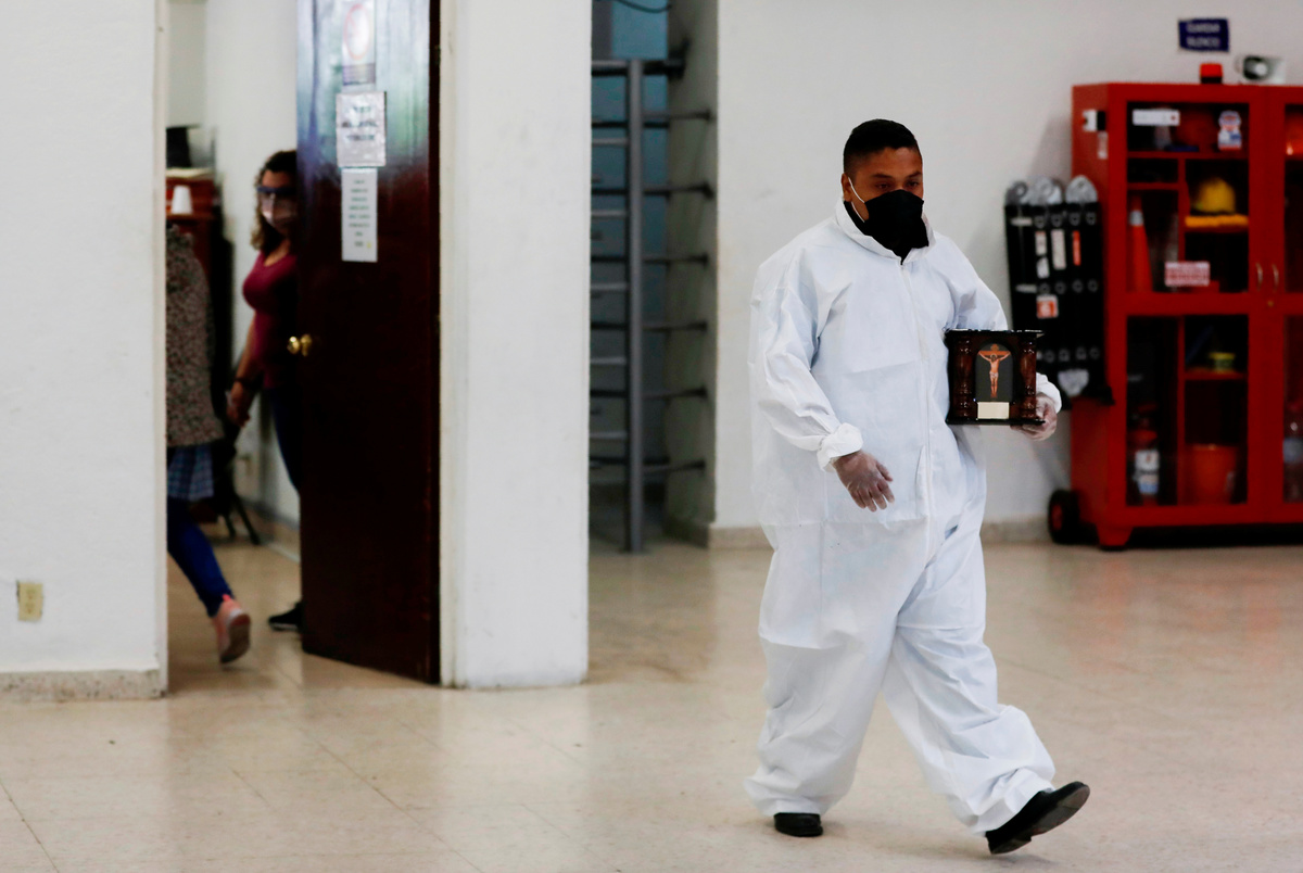 A funeral worker wearing personal protective equipment holds the urn with the remains of a victim of the coronavirus disease (COVID-19) at a crematorium waiting room, as the outbreak of COVID-19 continues in Mexico City, Mexico May 5, 2020. REUTERS/Carlos Jasso